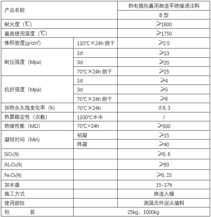 为了适应现代化钢厂对钢水测温定氧的准确性,我公司特研制了热电偶包裹用高绝缘自流平中性水性填料。产品完全脱离了上世纪80年代研制的酸性镁质填料,该产品使用自来水搅拌后就可直接浇注偶头,静放12小时后就可以进入烤箱烘烤,比传统酸性镁质填料缩短一倍烘烤时间就能达到理想的绝缘指数,本产品以其优良的自流动性、防潮性、操作简单性、测温准确性、高绝缘性、机械强度高、高温下不变形、不爆裂等点赢得了广大用户的一致好评。