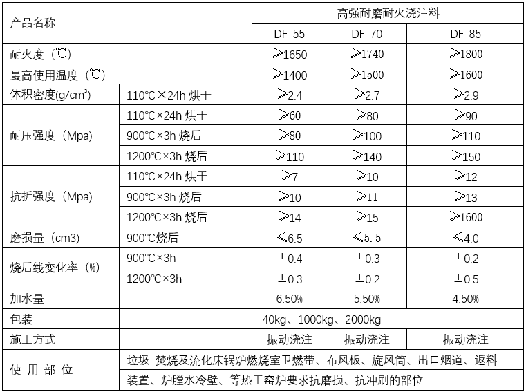 以下是本公司高强耐磨耐火浇注料的技术指标: