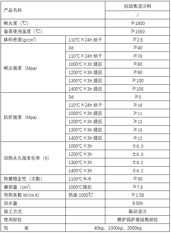 抗结焦浇注料是我公司专为大型燃煤及生物质锅炉炉膛前后拱开发的一种抗侵蚀浇注料,因燃煤及生物质锅炉在燃烧过程中产生的飞灰及可熔物结焦在前后拱上,随着时间的推移越积越多,会导致锅炉的热效率下降,严重的时候影响炉排运行,大量的结焦物粘结在锅炉前后拱上锅炉起停炉时,结焦物因温度变化会局部开裂、脱落造成前后拱浇注料连带脱落,严重影响锅炉运行及前后拱使用寿命。此抗结焦浇注料强度高,耐侵蚀,导热系数高,不易结焦,成功解决了以上难题。