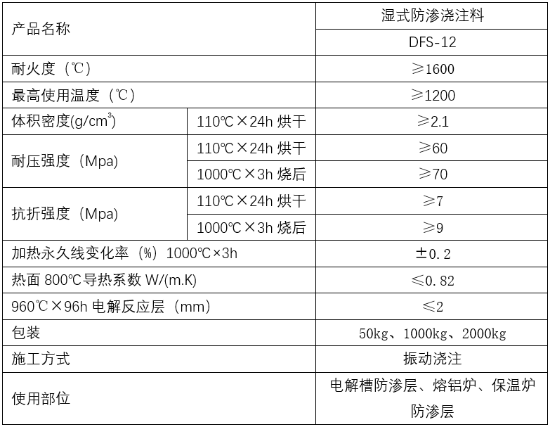湿式防渗浇注料是铝电解槽、铝熔池、铝保温炉等不可 缺少的筑炉防渗材料,由本公司开发的DFS-12型防渗耐火浇注料是一种低水泥浇注料,它具有较高的强度,较低的显气孔率和较小的平均孔径,施工时较少的用水量。在使用过程中,能与铝液反应,形成玻璃体履盖层,具有优良的抗渗性能。